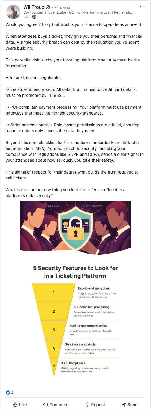 What helps you feel confident that a ticketing platform takes security seriously? Join the conversation on LinkedIn and share what you look for.