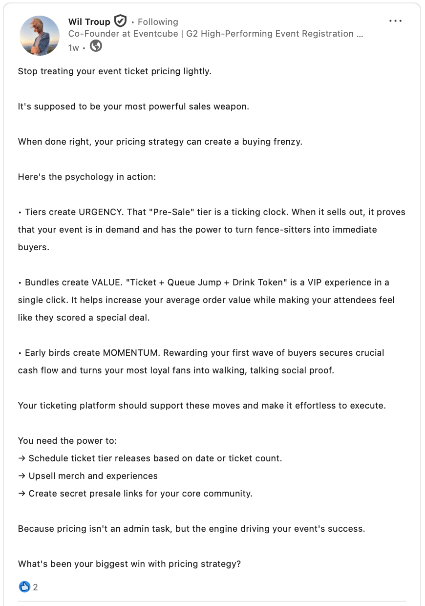How has pricing shaped the way your events gain momentum? Join the discussion on LinkedIn and share what you’ve seen work in practice.